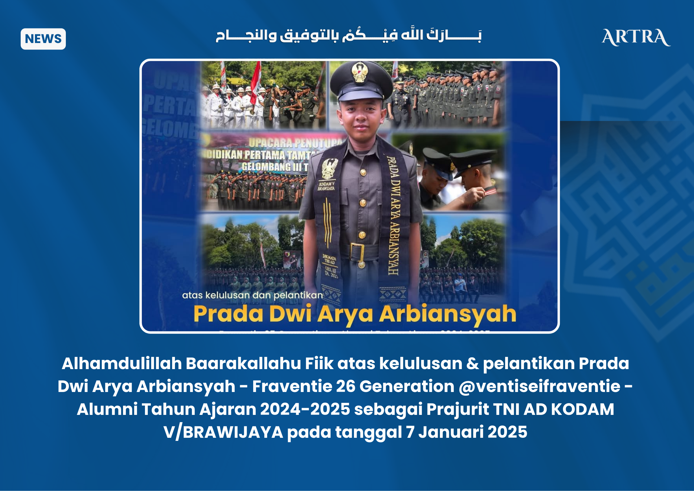 ARROHMAHPUTRA.COM – Kabar membanggakan kembali datang dari keluarga besar LPI Ar Rohmah Putra Malang. Salah satu lulusan terbaiknya dari angkatan 26 (Fraventie Generation), Dwi Arya Arbiansyah, resmi memulai masa pengabdiannya kepada negara sebagai prajurit TNI Angkatan Darat (AD).
