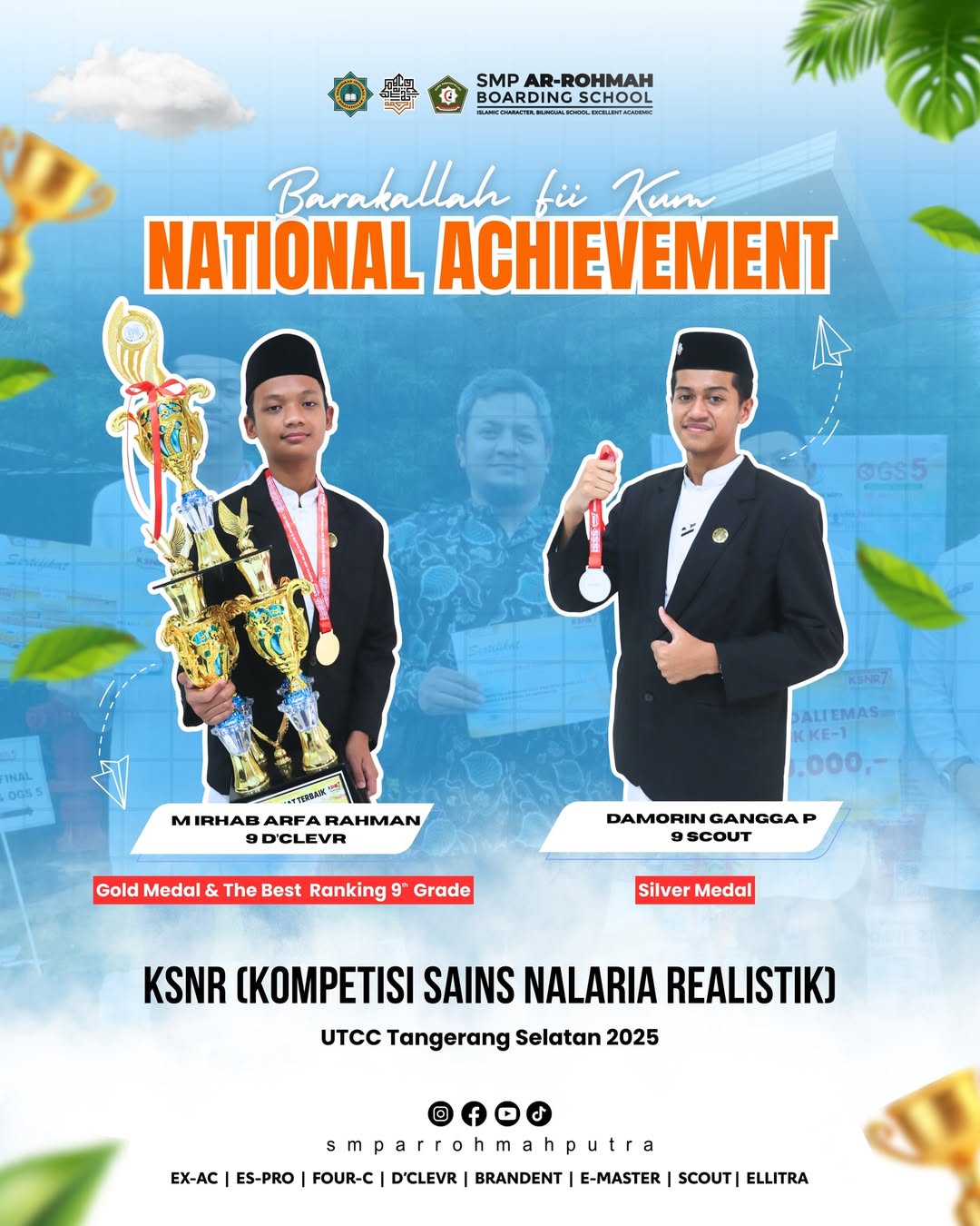 ARROHMAHPUTRA.COM- Dua siswa hebat dari SPARTA (SMP Ar Rohmah Putra) kembali membuktikan keunggulannya di panggung nasional. Dengan semangat belajar dan tekad yang kuat, keduanya berhasil membawa pulang medali emas dan perak dalam ajang bergengsi Kompetisi Sains Nalaria Realistik (KSNR).