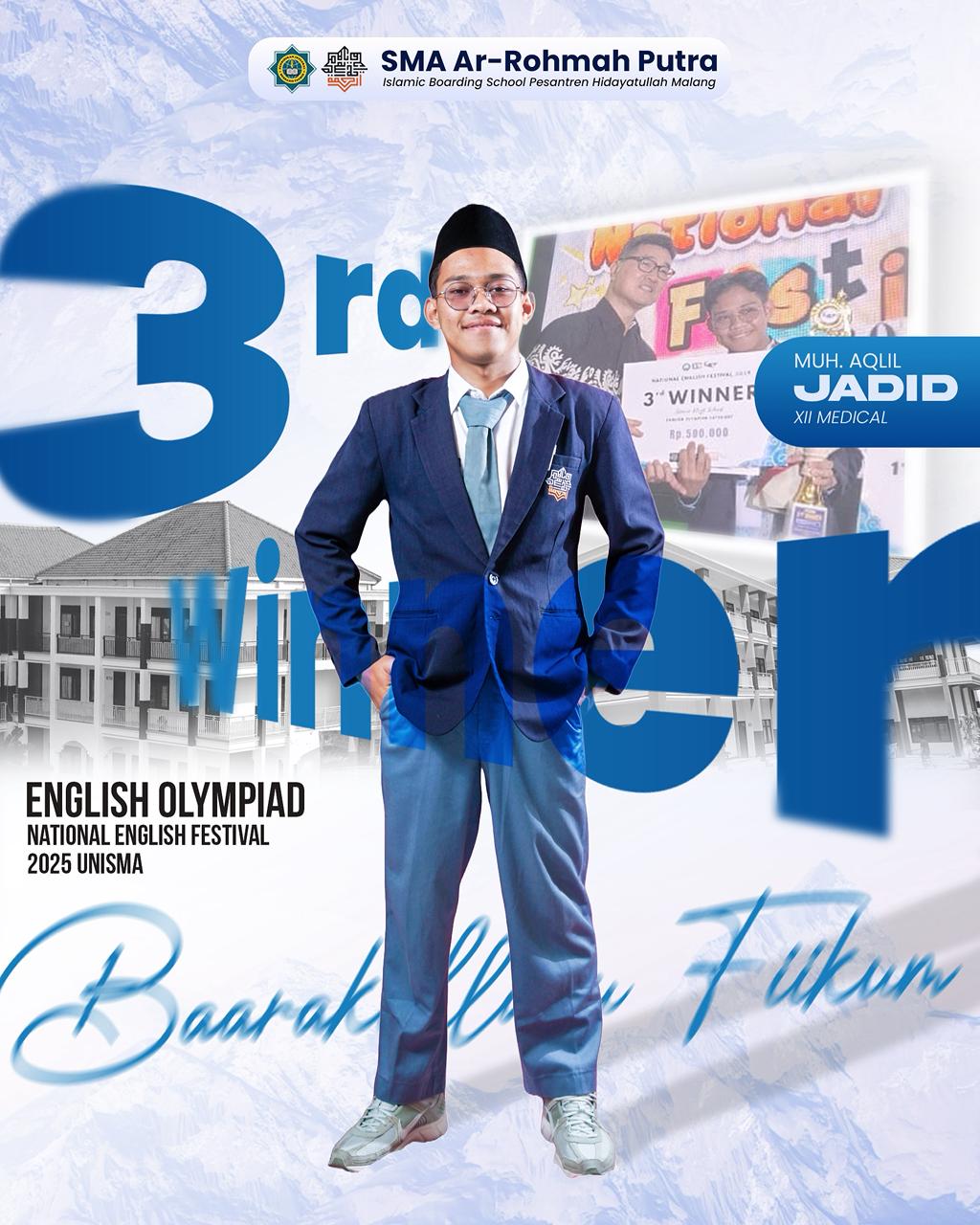AR ROHMAH PUTRA.com – Prestasi membanggakan kembali diukir oleh siswa berprestasi, Muhammad Aqlil Jadid (@_jadiiddd). Siswa yang duduk di kelas XII Medical ini berhasil menyabet gelar Juara 3 dalam ajang Olimpiade Bahasa Inggris “National English Festival 2025” tingkat Nasional.