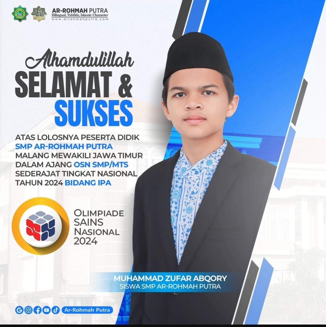 Sementara itu, Muhammad Zufar Abqory mengaku bersyukur dan terharu bisa menjadi perwakilan SMP Ar-Rohmah Putra dan Jawa Timur di ajang paling bergengsi se-Indonesia. Ia pun berharap mendapatkan prestasi tertinggi di OSN tingkat nasional yang digelar di Jakarta.