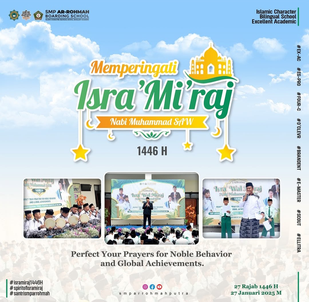 ARROHMAHPUTRA.COM — SMP Ar-Rohmah Putra Islamic Boarding School Pesantren Hidayatullah Malang menggelar peringatan Isra’ Mi’raj 1446 H di halaman gedung Ghaza, Senin (27/1).