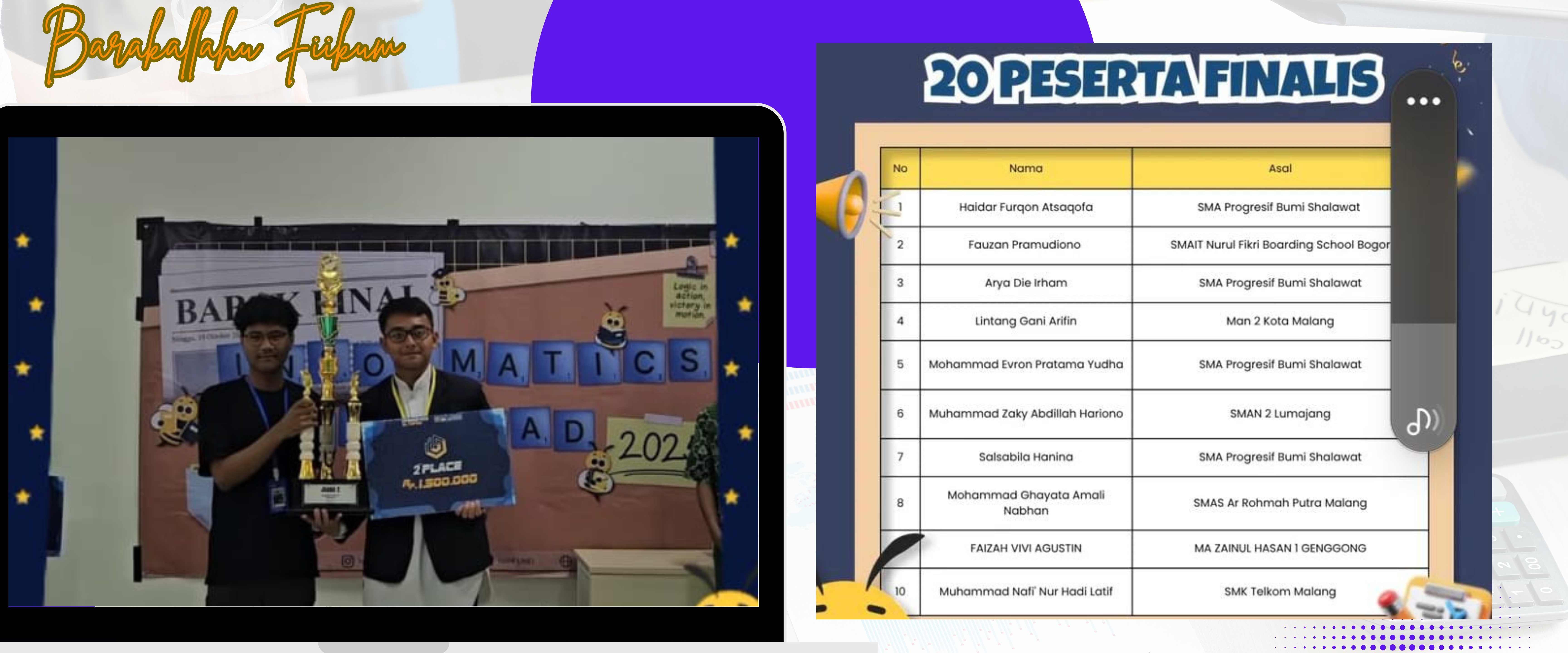ARROHMAHPUTRA.COM – Prestasi membanggakan kembali terukir atas nama Mohammad Ghayata Amali Nabhan. Siswa yang saat ini duduk di kelas 12 Engineering 1 tersebut berhasil dinobatkan sebagai juara dua dalam ajang bergengsi Olimpiade Komputer Tingkst Nasional yang diselenggarakan oleh Himpunan Mahasiswa Informatika (HMIF) Fakultas Ilmu Komputer Universitas Jember (UNEJ).